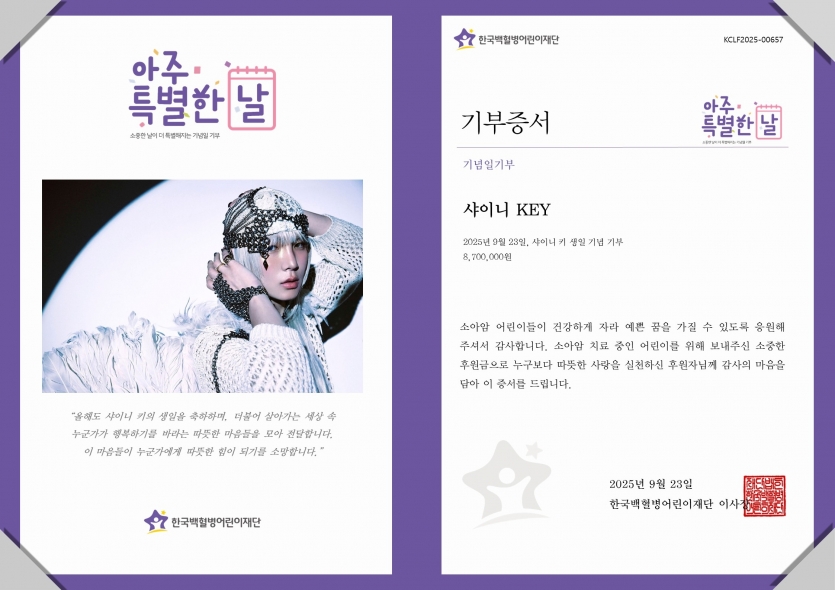 이번에 전달된 기부금 870만 원은 네이버 해피빈에 개설된 ‘Happy Key's bean’ 콩저금통을 통해 조성되었으며, 팬들의 뜻에 따라 전액 ‘샤이니 Key’의 이름으로 소아암 어린이 치료비 지원사업에 사용될 예정입니다.