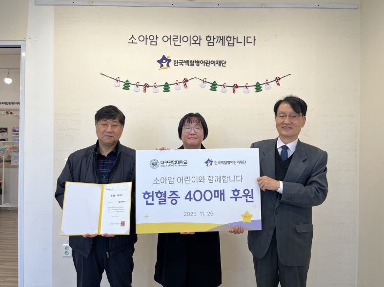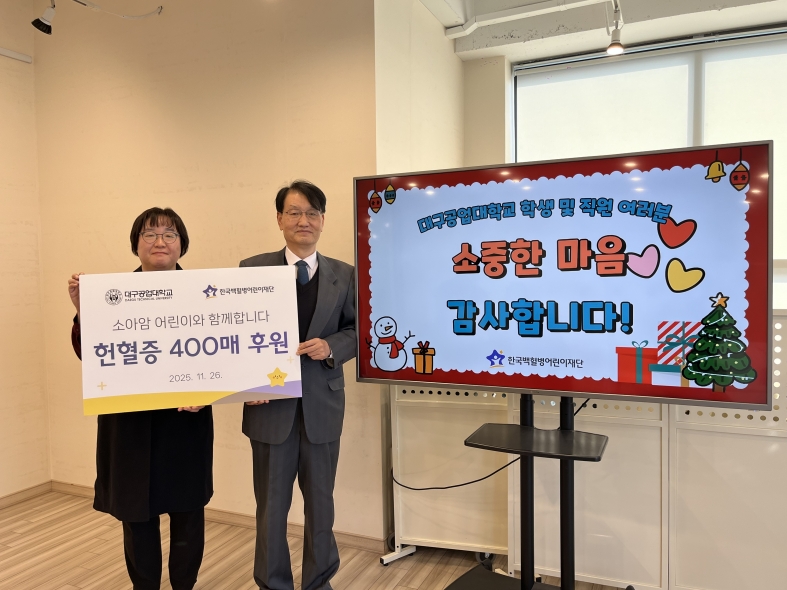11월 26일, 대구공업대학교에서 작년에 이어 올해에도 헌혈증 400매를 모아 대구나음소아암센터에 전달하였습니다.