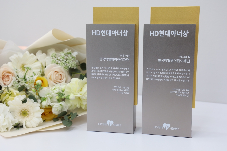 지난 12월 9일, HD현대1%나눔재단(이사장 권오갑)이 주관한 ‘제3회 HD현대아너상’ 시상식에서 한국백혈병어린이재단이 단체부문 ‘최우수상’과 ‘1%나눔상’을 동시에 수상했습니다.