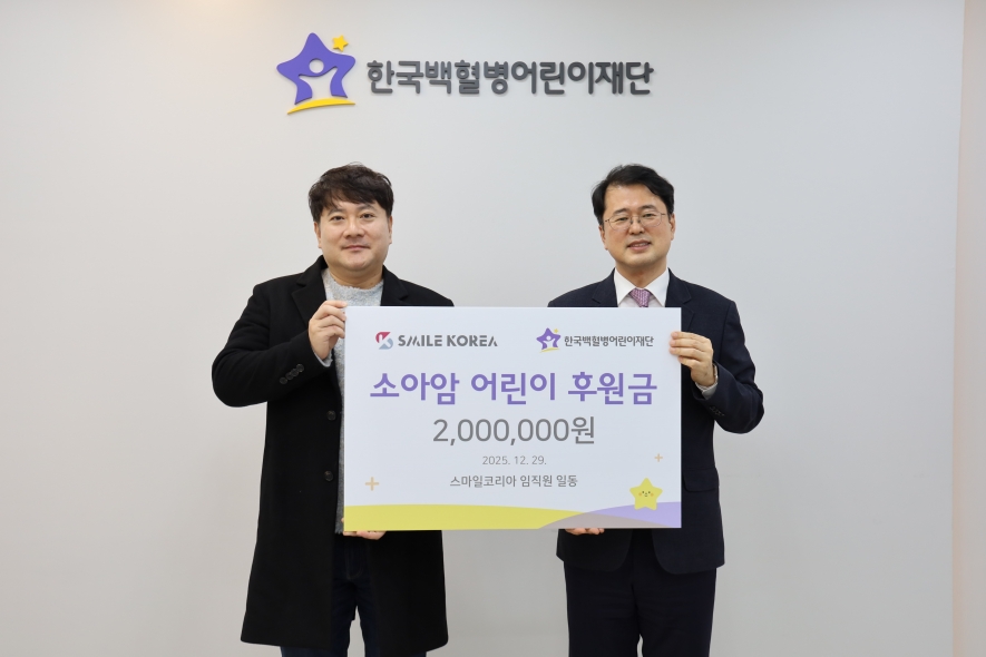 2025년 12월 29일, 주식회사 스마일코리아에서 소아암 어린이를 위해 후원금 2백만원을 전달하였습니다.