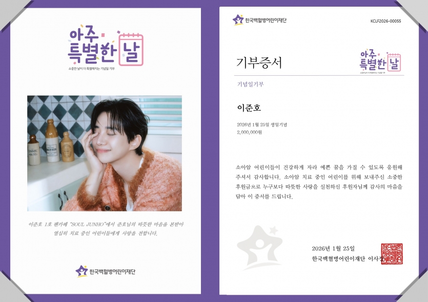 1월 25일, 이준호 님의 생일을 기념하여 이준호 1호 팬카페 ‘SOUL JUNHO’에서 올해도 소아암 어린이를 위한 후원금 2,000,000원을 전달해 주셨습니다.