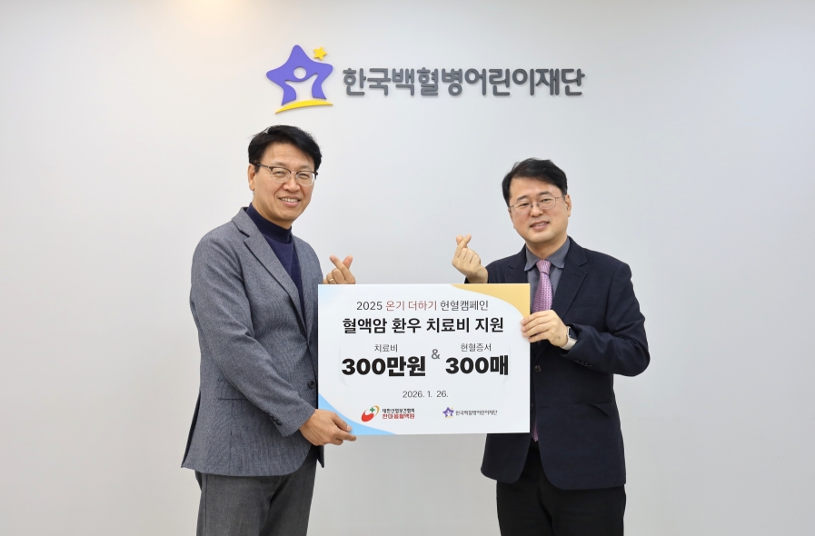 1월 26일, 대한산업보건협회 한마음혈액원에서 소아암 어린이를 위한 기부금 300만 원과 헌혈증서 300매를 전달했습니다.