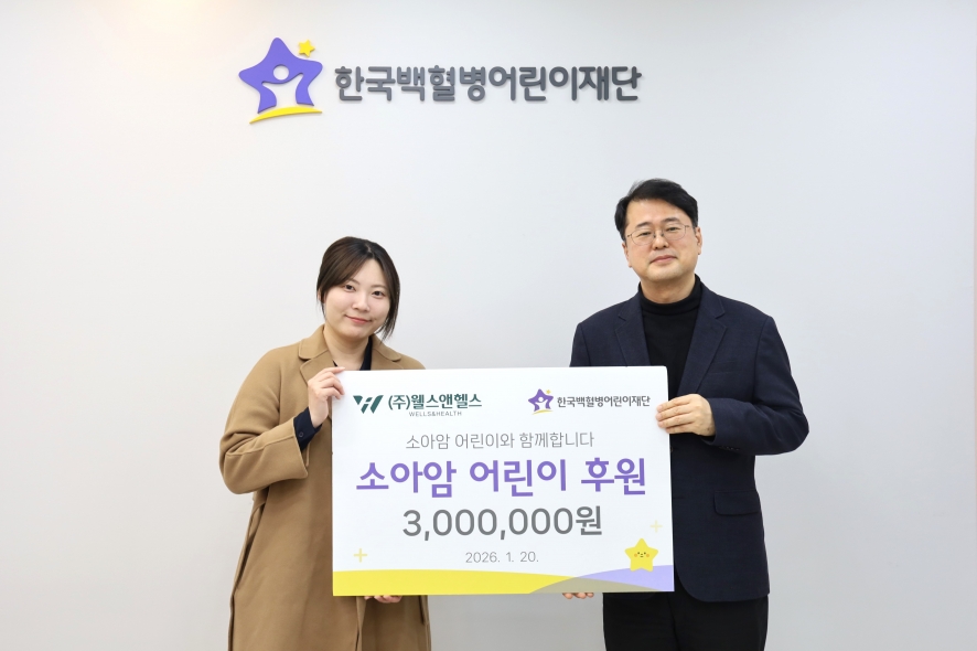 1월 29일, 건강식품 생산 유통 전문기업인 (주)웰스앤헬스에서 소아암 어린이를 위한 후원금 300만 원을 전달했습니다.