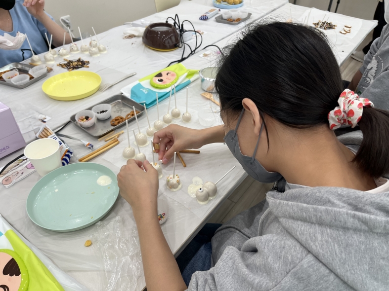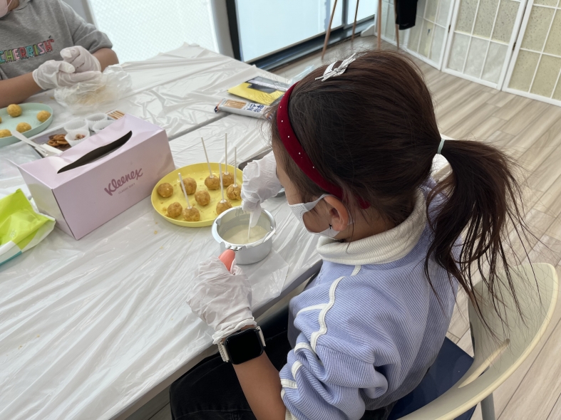 먼저 잘게 부순 카스테라에 생크림을 넣어 동그란 모양을 만들고, 초콜릿을 입힌 뒤 막대를 꽂아 귀여운 케이크팝을 완성했어요.