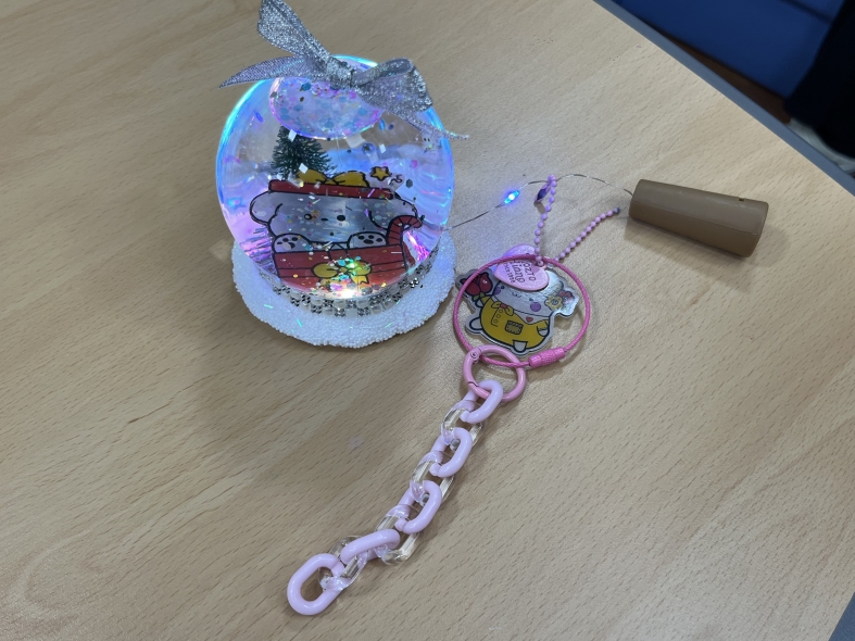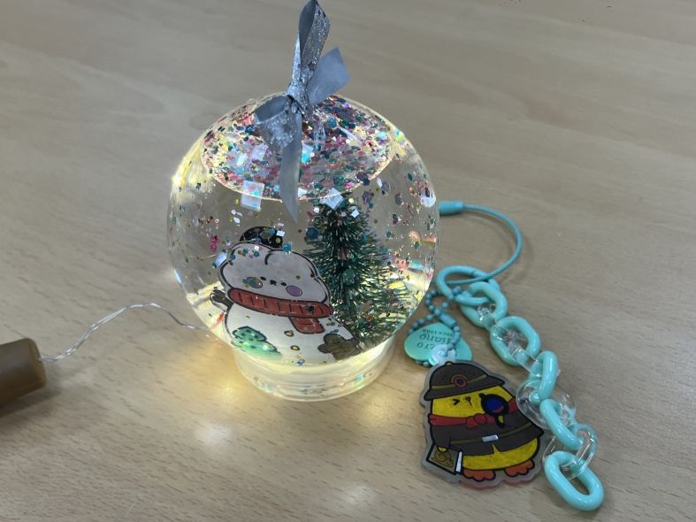 또 다른 쉬링클스 장식은 스노우볼 안에 넣고, 클레이와 스티커를 활용해 정성껏 꾸며 나만의 예쁜 스노우볼을 만들었습니다.